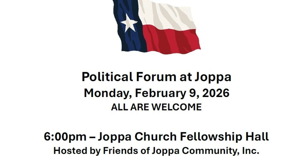 Joppa is hosting County Commissioner Place 2 candidates Damon Beierle and Leonard Guenter and County Judge candidates Bryan Wilson and Alan Trevino on February 9, 6:00pm at the Joppa Fellowship Hall for a Political Forum. This is our opportunity to ask questions of these candidates on topics that concern you.